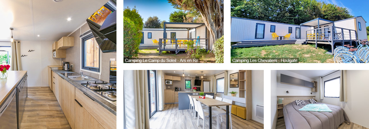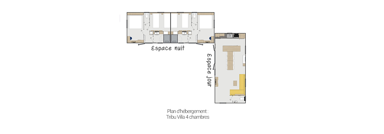 Profiteer van de Tribu Villa-reeks: 2 stacaravans in L-vorm om uw hele familie te verzamelen. Dankzij het grote gemeenschappelijke terras dat de 2 stacaravans verbindt, kunt u samenkomen voor momenten van lachen en vreugde. De Tribu heeft een nachtruimte met 4 slaapkamers en 2 badkamers, en een dagruimte met een grote woonkamer en een eilandkeuken.