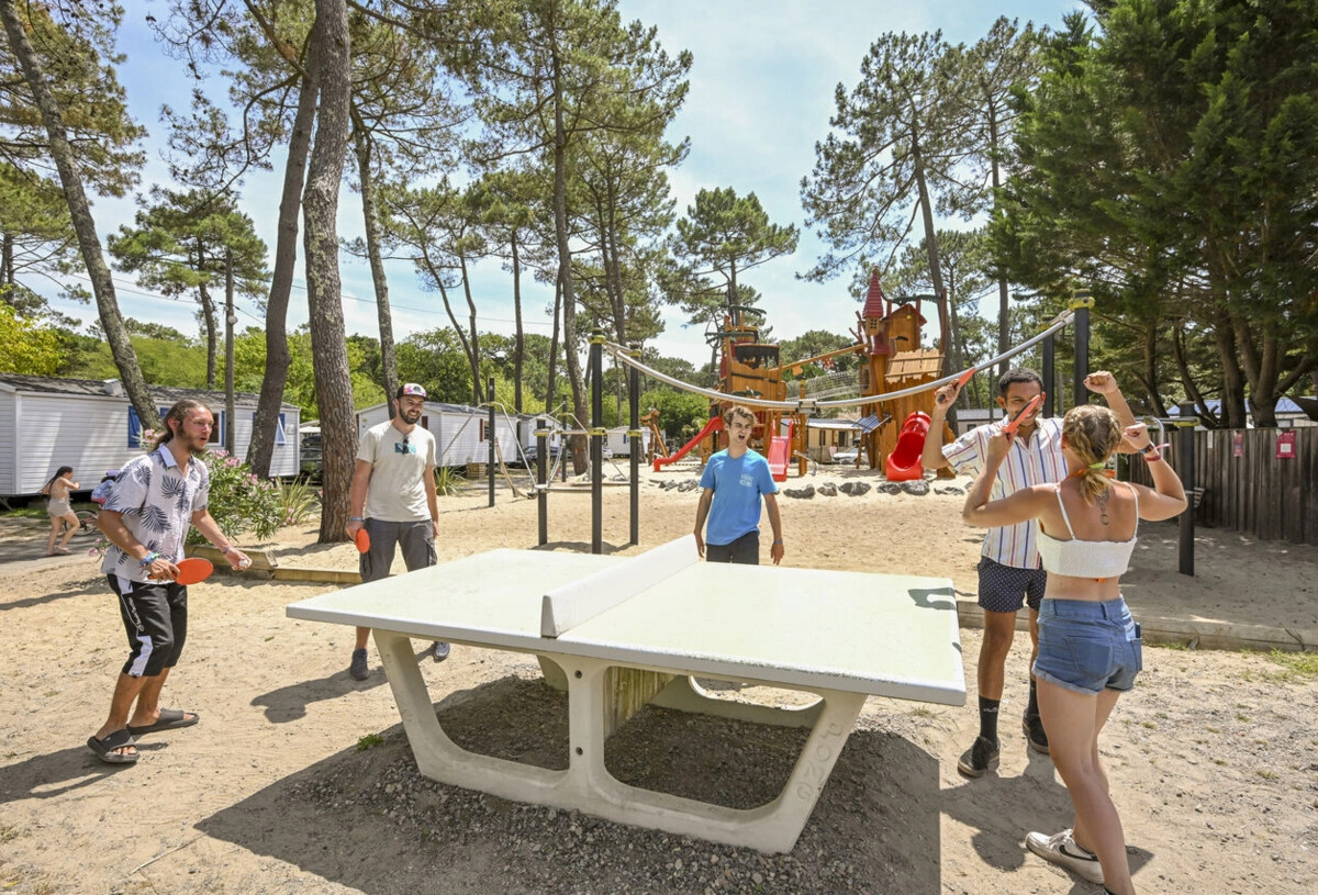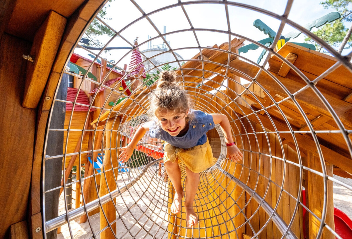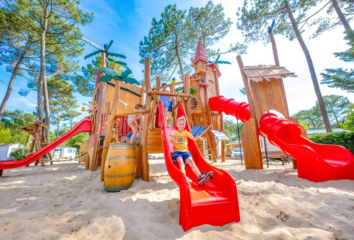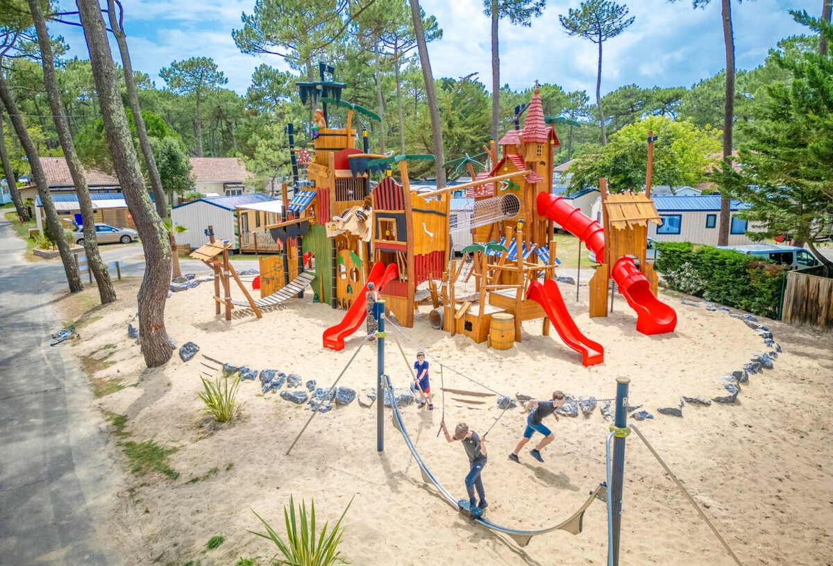 Ja, de nieuwe houten speeltuin : leuke avonturenspelletjes voor kleine piratenavonturiers! Camping Marina Landes heeft ook opblaasbare speeltoestellen en een multisportterrein. Voor meer informatie
