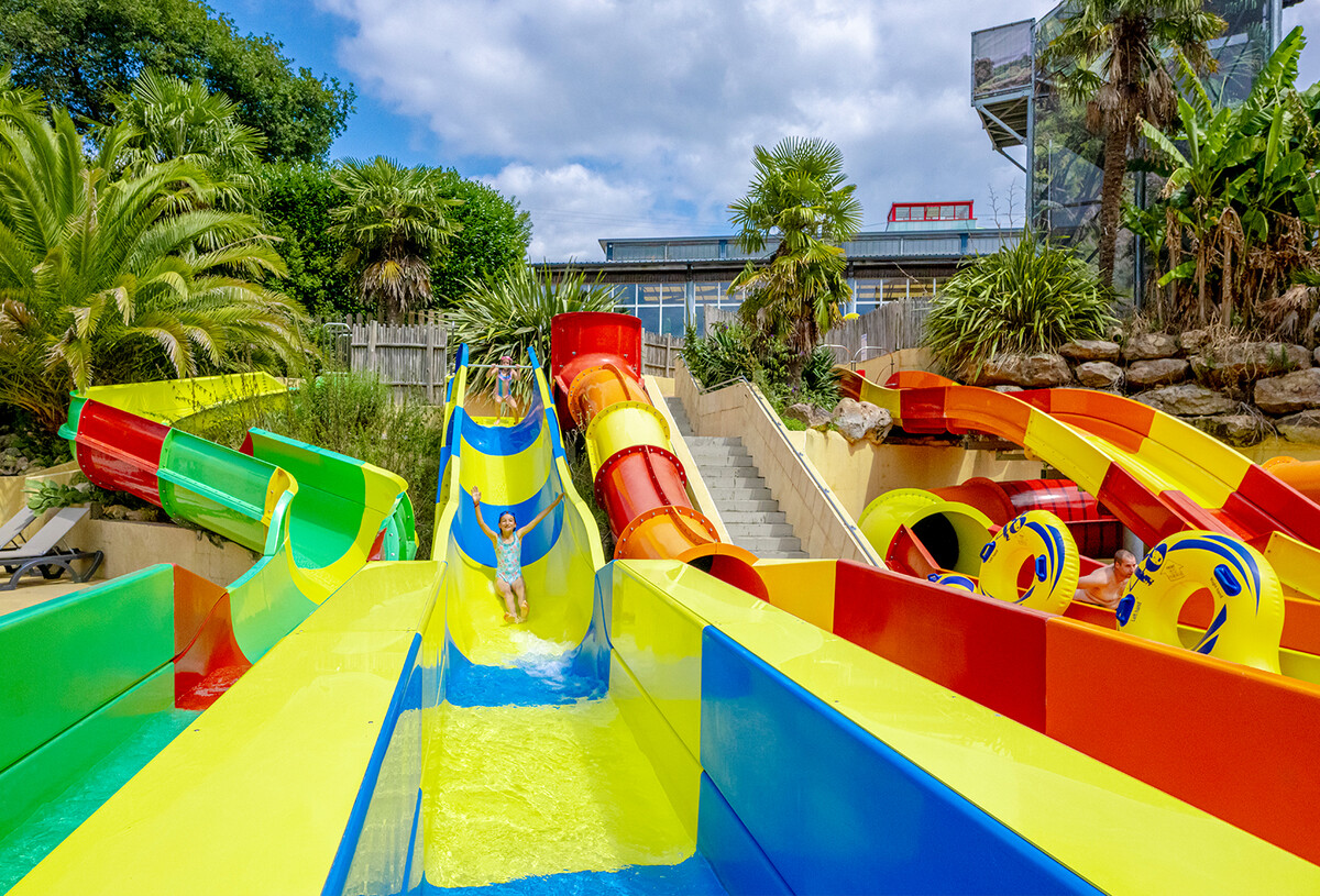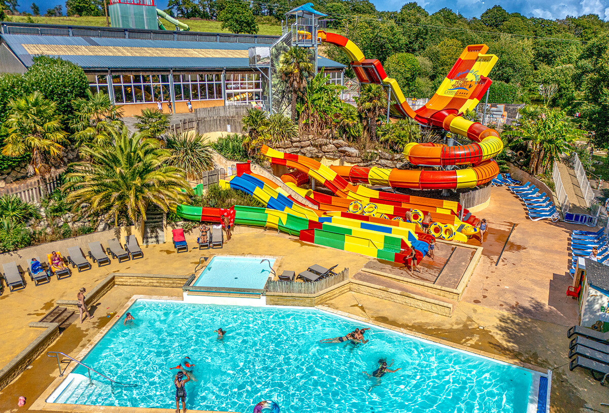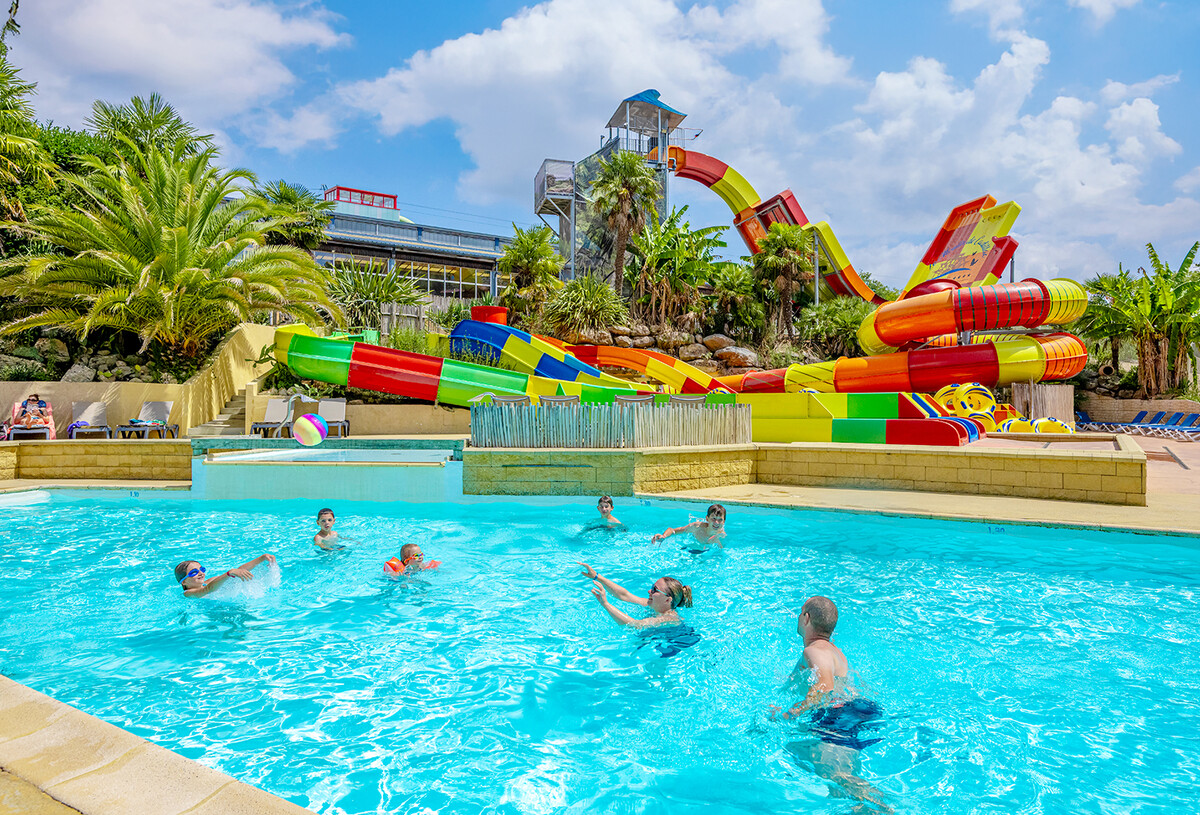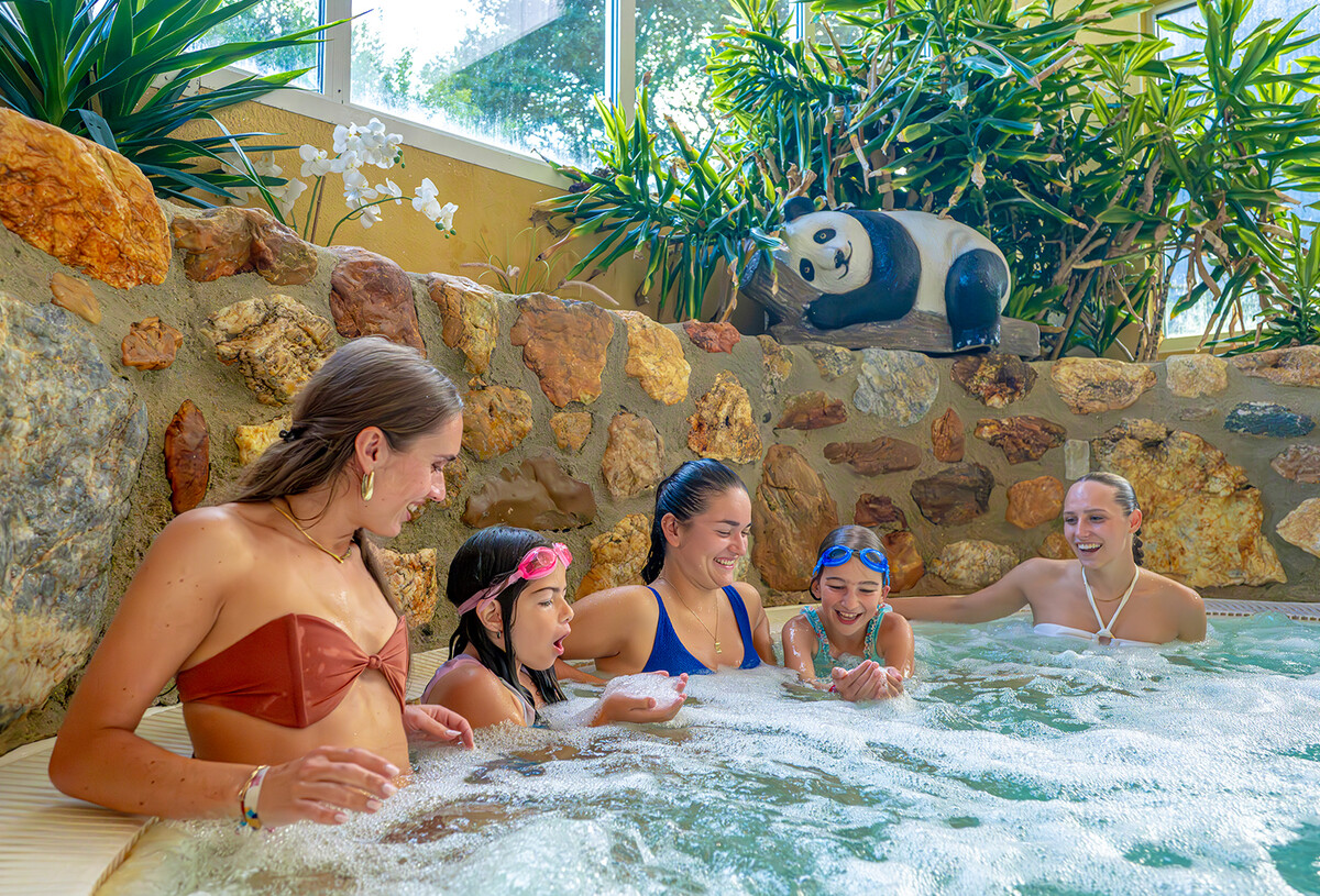 - 1 groot overdekt zwembad in een kleurrijke, bloemrijke omgeving met een groot zwembad, peuterbad, en glijbanen (1 Spacebowl, 1 Kamikaze en 4 Pentagliss en 2 glijbanen).